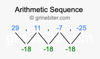 So, what type of sequence is 29, 11, -7, -25? The sequence 29, 11, -7, -25 has a common difference of -18 between each term. We call this kind of sequence an arithmetic sequence. Below is an image illustrating the correlation between the arithmetic sequence 29, 11, -7, -25 and its common difference of -18.