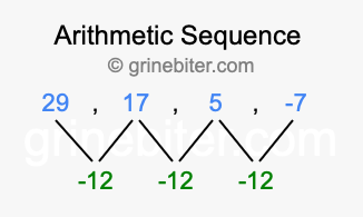 So, what type of sequence is 29, 17, 5, -7? The sequence 29, 17, 5, -7 has a common difference of -12 between each term. We call this kind of sequence an arithmetic sequence. Below is an image illustrating the correlation between the arithmetic sequence 29, 17, 5, -7 and its common difference of -12.