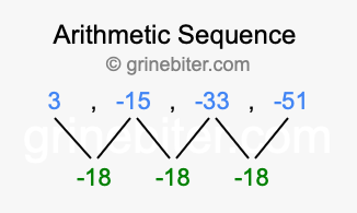 So, what type of sequence is 3, -15, -33, -51? The sequence 3, -15, -33, -51 has a common difference of -18 between each term. We call this kind of sequence an arithmetic sequence. Below is an image illustrating the correlation between the arithmetic sequence 3, -15, -33, -51 and its common difference of -18.