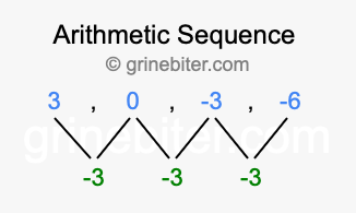 So, what type of sequence is 3, 0, -3, -6? The sequence 3, 0, -3, -6 has a common difference of -3 between each term. We call this kind of sequence an arithmetic sequence. Below is an image illustrating the correlation between the arithmetic sequence 3, 0, -3, -6 and its common difference of -3.