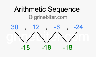 So, what type of sequence is 30, 12, -6, -24? The sequence 30, 12, -6, -24 has a common difference of -18 between each term. We call this kind of sequence an arithmetic sequence. Below is an image illustrating the correlation between the arithmetic sequence 30, 12, -6, -24 and its common difference of -18.