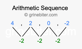 So, what type of sequence is 4, 2, 0, -2? The sequence 4, 2, 0, -2 has a common difference of -2 between each term. We call this kind of sequence an arithmetic sequence. Below is an image illustrating the correlation between the arithmetic sequence 4, 2, 0, -2 and its common difference of -2.