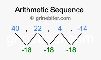 So, what type of sequence is 40, 22, 4, -14? The sequence 40, 22, 4, -14 has a common difference of -18 between each term. We call this kind of sequence an arithmetic sequence. Below is an image illustrating the correlation between the arithmetic sequence 40, 22, 4, -14 and its common difference of -18.
