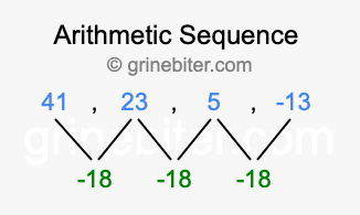 So, what type of sequence is 41, 23, 5, -13? The sequence 41, 23, 5, -13 has a common difference of -18 between each term. We call this kind of sequence an arithmetic sequence. Below is an image illustrating the correlation between the arithmetic sequence 41, 23, 5, -13 and its common difference of -18.