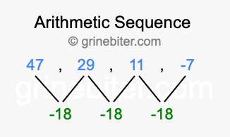 So, what type of sequence is 47, 29, 11, -7? The sequence 47, 29, 11, -7 has a common difference of -18 between each term. We call this kind of sequence an arithmetic sequence. Below is an image illustrating the correlation between the arithmetic sequence 47, 29, 11, -7 and its common difference of -18.