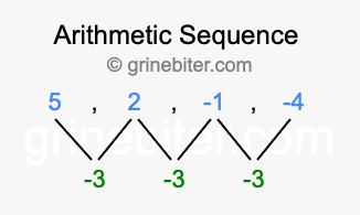 So, what type of sequence is 5, 2, -1, -4? The sequence 5, 2, -1, -4 has a common difference of -3 between each term. We call this kind of sequence an arithmetic sequence. Below is an image illustrating the correlation between the arithmetic sequence 5, 2, -1, -4 and its common difference of -3.