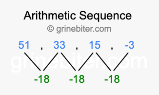 So, what type of sequence is 51, 33, 15, -3? The sequence 51, 33, 15, -3 has a common difference of -18 between each term. We call this kind of sequence an arithmetic sequence. Below is an image illustrating the correlation between the arithmetic sequence 51, 33, 15, -3 and its common difference of -18.