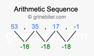 So, what type of sequence is 53, 35, 17, -1? The sequence 53, 35, 17, -1 has a common difference of -18 between each term. We call this kind of sequence an arithmetic sequence. Below is an image illustrating the correlation between the arithmetic sequence 53, 35, 17, -1 and its common difference of -18.