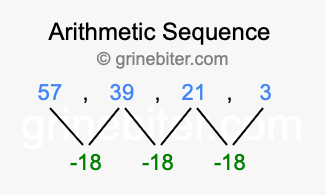 So, what type of sequence is 57, 39, 21, 3? The sequence 57, 39, 21, 3 has a common difference of -18 between each term. We call this kind of sequence an arithmetic sequence. Below is an image illustrating the correlation between the arithmetic sequence 57, 39, 21, 3 and its common difference of -18.