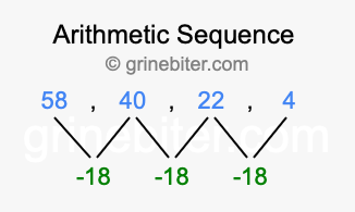 So, what type of sequence is 58, 40, 22, 4? The sequence 58, 40, 22, 4 has a common difference of -18 between each term. We call this kind of sequence an arithmetic sequence. Below is an image illustrating the correlation between the arithmetic sequence 58, 40, 22, 4 and its common difference of -18.