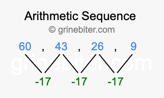 So, what type of sequence is 60, 43, 26, 9? The sequence 60, 43, 26, 9 has a common difference of -17 between each term. We call this kind of sequence an arithmetic sequence. Below is an image illustrating the correlation between the arithmetic sequence 60, 43, 26, 9 and its common difference of -17.