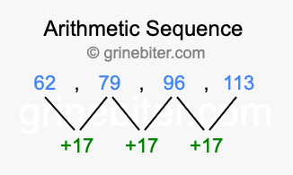 So, what type of sequence is 62, 79, 96, 113? The sequence 62, 79, 96, 113 has a common difference of +17 between each term. We call this kind of sequence an arithmetic sequence. Below is an image illustrating the correlation between the arithmetic sequence 62, 79, 96, 113 and its common difference of +17.