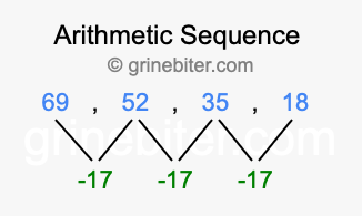 So, what type of sequence is 69, 52, 35, 18? The sequence 69, 52, 35, 18 has a common difference of -17 between each term. We call this kind of sequence an arithmetic sequence. Below is an image illustrating the correlation between the arithmetic sequence 69, 52, 35, 18 and its common difference of -17.