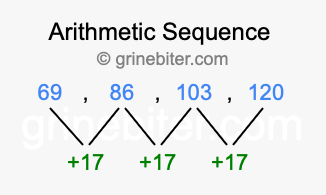 So, what type of sequence is 69, 86, 103, 120? The sequence 69, 86, 103, 120 has a common difference of +17 between each term. We call this kind of sequence an arithmetic sequence. Below is an image illustrating the correlation between the arithmetic sequence 69, 86, 103, 120 and its common difference of +17.