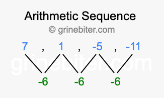 So, what type of sequence is 7, 1, -5, -11? The sequence 7, 1, -5, -11 has a common difference of -6 between each term. We call this kind of sequence an arithmetic sequence. Below is an image illustrating the correlation between the arithmetic sequence 7, 1, -5, -11 and its common difference of -6.