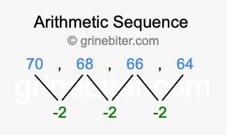 So, what type of sequence is 70, 68, 66, 64? The sequence 70, 68, 66, 64 has a common difference of -2 between each term. We call this kind of sequence an arithmetic sequence. Below is an image illustrating the correlation between the arithmetic sequence 70, 68, 66, 64 and its common difference of -2.