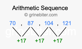 So, what type of sequence is 70, 87, 104, 121? The sequence 70, 87, 104, 121 has a common difference of +17 between each term. We call this kind of sequence an arithmetic sequence. Below is an image illustrating the correlation between the arithmetic sequence 70, 87, 104, 121 and its common difference of +17.