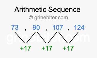 So, what type of sequence is 73, 90, 107, 124? The sequence 73, 90, 107, 124 has a common difference of +17 between each term. We call this kind of sequence an arithmetic sequence. Below is an image illustrating the correlation between the arithmetic sequence 73, 90, 107, 124 and its common difference of +17.