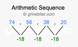 So, what type of sequence is 74, 56, 38, 20? The sequence 74, 56, 38, 20 has a common difference of -18 between each term. We call this kind of sequence an arithmetic sequence. Below is an image illustrating the correlation between the arithmetic sequence 74, 56, 38, 20 and its common difference of -18.