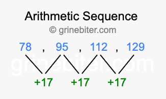 So, what type of sequence is 78, 95, 112, 129? The sequence 78, 95, 112, 129 has a common difference of +17 between each term. We call this kind of sequence an arithmetic sequence. Below is an image illustrating the correlation between the arithmetic sequence 78, 95, 112, 129 and its common difference of +17.