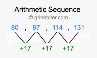 So, what type of sequence is 80, 97, 114, 131? The sequence 80, 97, 114, 131 has a common difference of +17 between each term. We call this kind of sequence an arithmetic sequence. Below is an image illustrating the correlation between the arithmetic sequence 80, 97, 114, 131 and its common difference of +17.
