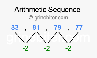 So, what type of sequence is 83, 81, 79, 77? The sequence 83, 81, 79, 77 has a common difference of -2 between each term. We call this kind of sequence an arithmetic sequence. Below is an image illustrating the correlation between the arithmetic sequence 83, 81, 79, 77 and its common difference of -2.