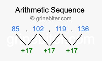 So, what type of sequence is 85, 102, 119, 136? The sequence 85, 102, 119, 136 has a common difference of +17 between each term. We call this kind of sequence an arithmetic sequence. Below is an image illustrating the correlation between the arithmetic sequence 85, 102, 119, 136 and its common difference of +17.