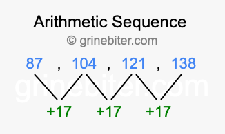So, what type of sequence is 87, 104, 121, 138? The sequence 87, 104, 121, 138 has a common difference of +17 between each term. We call this kind of sequence an arithmetic sequence. Below is an image illustrating the correlation between the arithmetic sequence 87, 104, 121, 138 and its common difference of +17.
