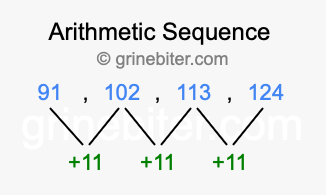 So, what type of sequence is 91, 102, 113, 124? The sequence 91, 102, 113, 124 has a common difference of +11 between each term. We call this kind of sequence an arithmetic sequence. Below is an image illustrating the correlation between the arithmetic sequence 91, 102, 113, 124 and its common difference of +11.