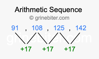 So, what type of sequence is 91, 108, 125, 142? The sequence 91, 108, 125, 142 has a common difference of +17 between each term. We call this kind of sequence an arithmetic sequence. Below is an image illustrating the correlation between the arithmetic sequence 91, 108, 125, 142 and its common difference of +17.
