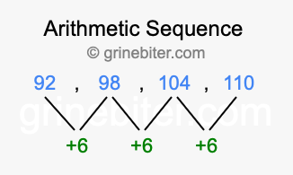 So, what type of sequence is 92, 98, 104, 110? The sequence 92, 98, 104, 110 has a common difference of +6 between each term. We call this kind of sequence an arithmetic sequence. Below is an image illustrating the correlation between the arithmetic sequence 92, 98, 104, 110 and its common difference of +6.