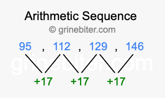 So, what type of sequence is 95, 112, 129, 146? The sequence 95, 112, 129, 146 has a common difference of +17 between each term. We call this kind of sequence an arithmetic sequence. Below is an image illustrating the correlation between the arithmetic sequence 95, 112, 129, 146 and its common difference of +17.