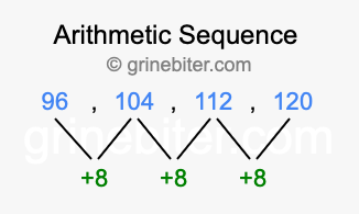So, what type of sequence is 96, 104, 112, 120? The sequence 96, 104, 112, 120 has a common difference of +8 between each term. We call this kind of sequence an arithmetic sequence. Below is an image illustrating the correlation between the arithmetic sequence 96, 104, 112, 120 and its common difference of +8.