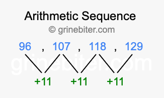 So, what type of sequence is 96, 107, 118, 129? The sequence 96, 107, 118, 129 has a common difference of +11 between each term. We call this kind of sequence an arithmetic sequence. Below is an image illustrating the correlation between the arithmetic sequence 96, 107, 118, 129 and its common difference of +11.