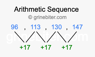 So, what type of sequence is 96, 113, 130, 147? The sequence 96, 113, 130, 147 has a common difference of +17 between each term. We call this kind of sequence an arithmetic sequence. Below is an image illustrating the correlation between the arithmetic sequence 96, 113, 130, 147 and its common difference of +17.