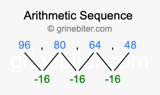So, what type of sequence is 96, 80, 64, 48? The sequence 96, 80, 64, 48 has a common difference of -16 between each term. We call this kind of sequence an arithmetic sequence. Below is an image illustrating the correlation between the arithmetic sequence 96, 80, 64, 48 and its common difference of -16.