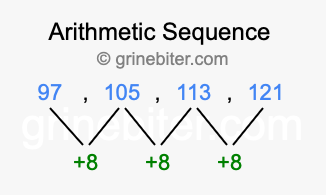 So, what type of sequence is 97, 105, 113, 121? The sequence 97, 105, 113, 121 has a common difference of +8 between each term. We call this kind of sequence an arithmetic sequence. Below is an image illustrating the correlation between the arithmetic sequence 97, 105, 113, 121 and its common difference of +8.