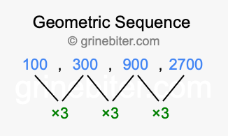 So, what type of sequence is 100, 300, 900, 2700? The sequence 100, 300, 900, 2700 has a common ratio of 3 between each term. We call this kind of sequence a geometric sequence. Below is an image illustrating the correlation between the geometric sequence 100, 300, 900, 2700 and its common ratio of 3.