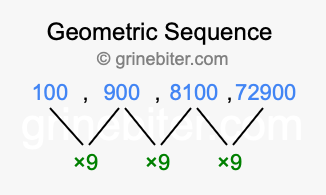 So, what type of sequence is 100, 900, 8100, 72900? The sequence 100, 900, 8100, 72900 has a common ratio of 9 between each term. We call this kind of sequence a geometric sequence. Below is an image illustrating the correlation between the geometric sequence 100, 900, 8100, 72900 and its common ratio of 9.