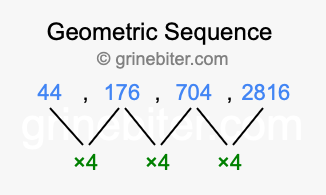 So, what type of sequence is 44, 176, 704, 2816? The sequence 44, 176, 704, 2816 has a common ratio of 4 between each term. We call this kind of sequence a geometric sequence. Below is an image illustrating the correlation between the geometric sequence 44, 176, 704, 2816 and its common ratio of 4.