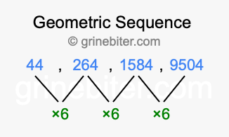 So, what type of sequence is 44, 264, 1584, 9504? The sequence 44, 264, 1584, 9504 has a common ratio of 6 between each term. We call this kind of sequence a geometric sequence. Below is an image illustrating the correlation between the geometric sequence 44, 264, 1584, 9504 and its common ratio of 6.