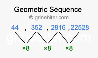 So, what type of sequence is 44, 352, 2816, 22528? The sequence 44, 352, 2816, 22528 has a common ratio of 8 between each term. We call this kind of sequence a geometric sequence. Below is an image illustrating the correlation between the geometric sequence 44, 352, 2816, 22528 and its common ratio of 8.