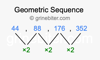 So, what type of sequence is 44, 88, 176, 352? The sequence 44, 88, 176, 352 has a common ratio of 2 between each term. We call this kind of sequence a geometric sequence. Below is an image illustrating the correlation between the geometric sequence 44, 88, 176, 352 and its common ratio of 2.